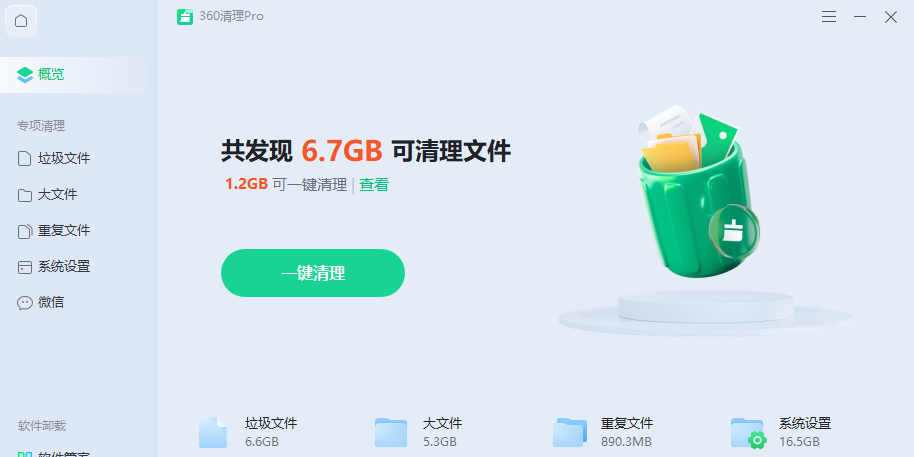 360清理Pro是一款电脑清理工具,覆盖:C盘清理、微信清理、QQ清理、隐私清理四大场景,功能包括垃圾文件清理、大文件垃圾文件清理、重复文件垃圾文件清理、微信和QQ的图片、缓存、日…